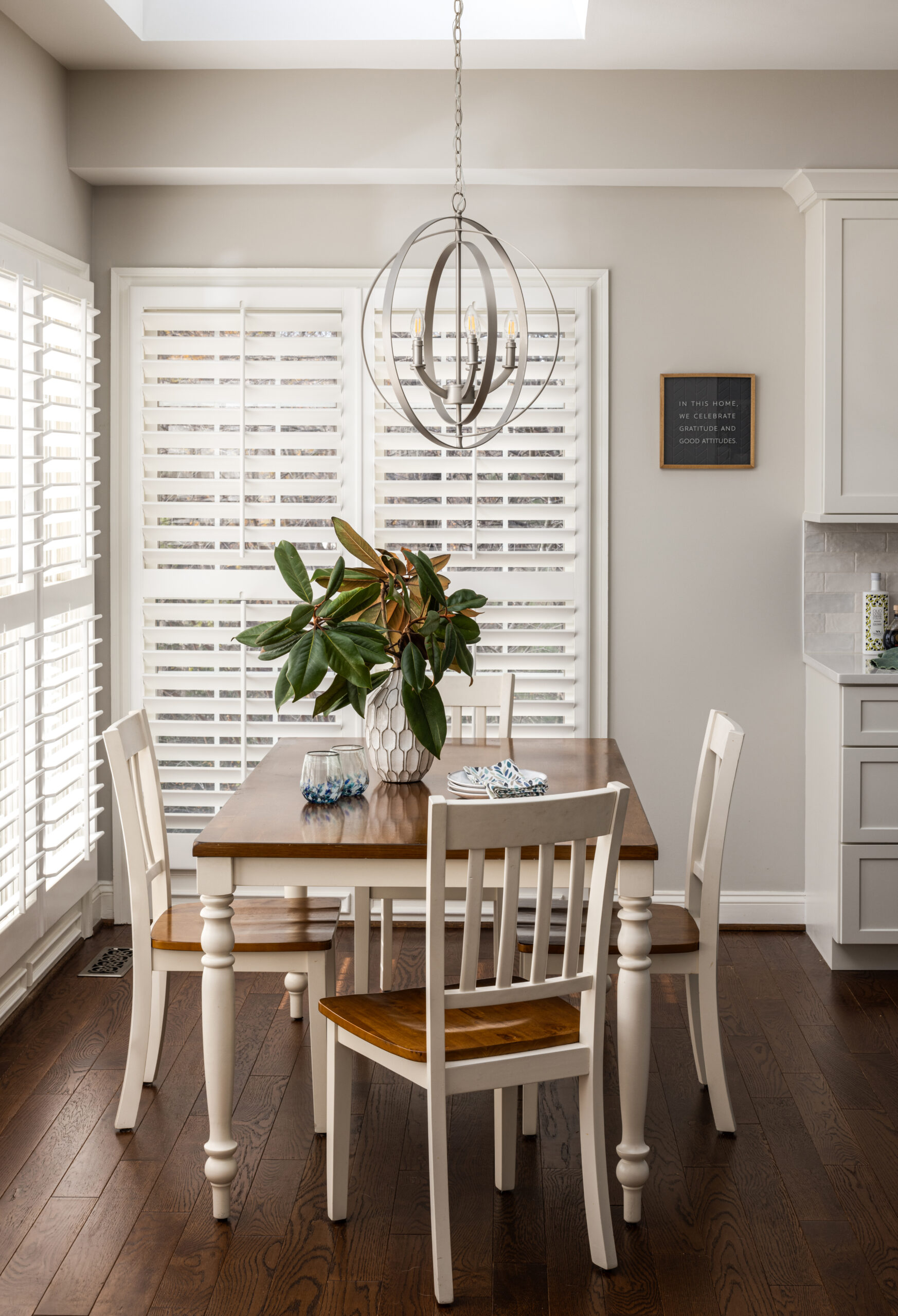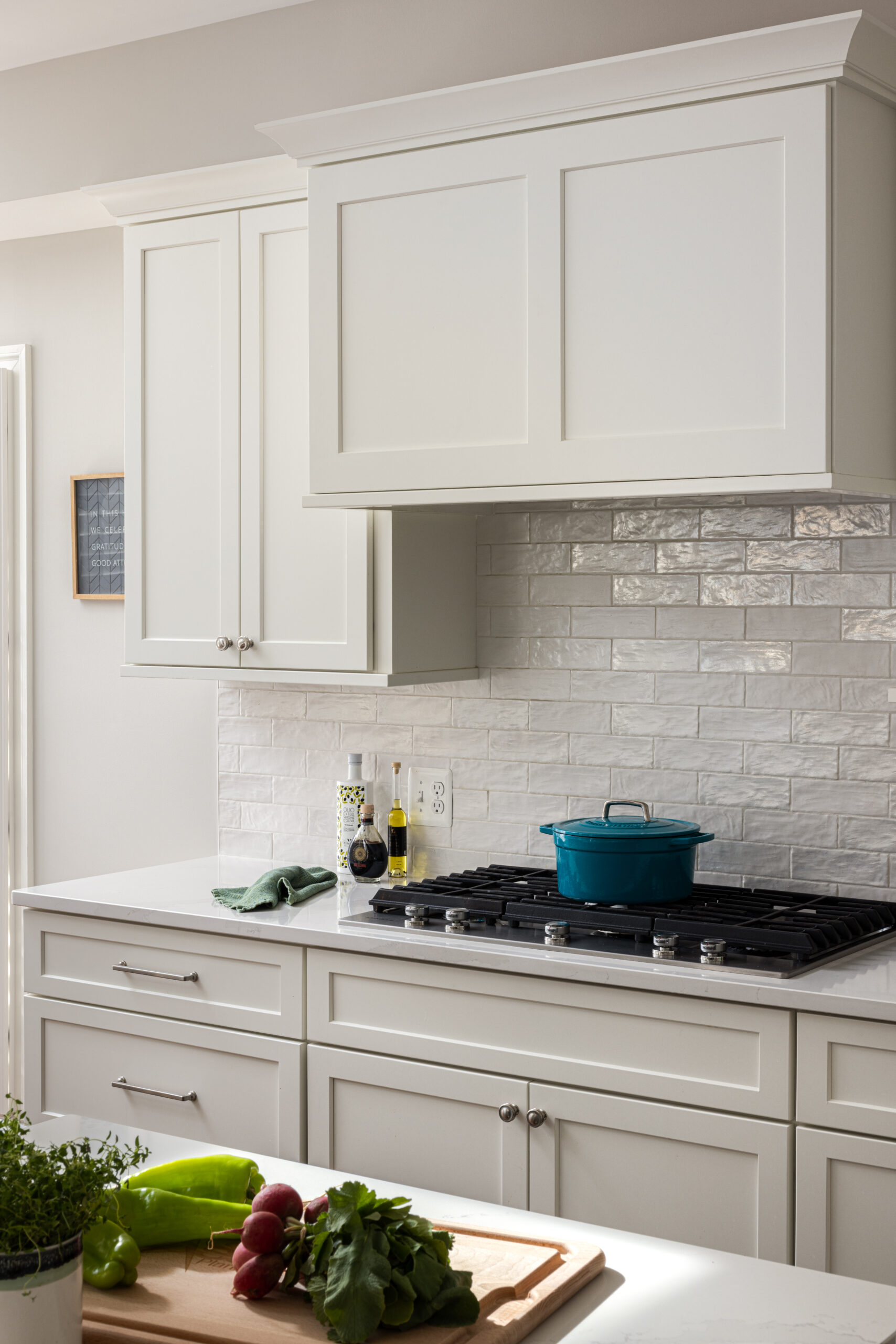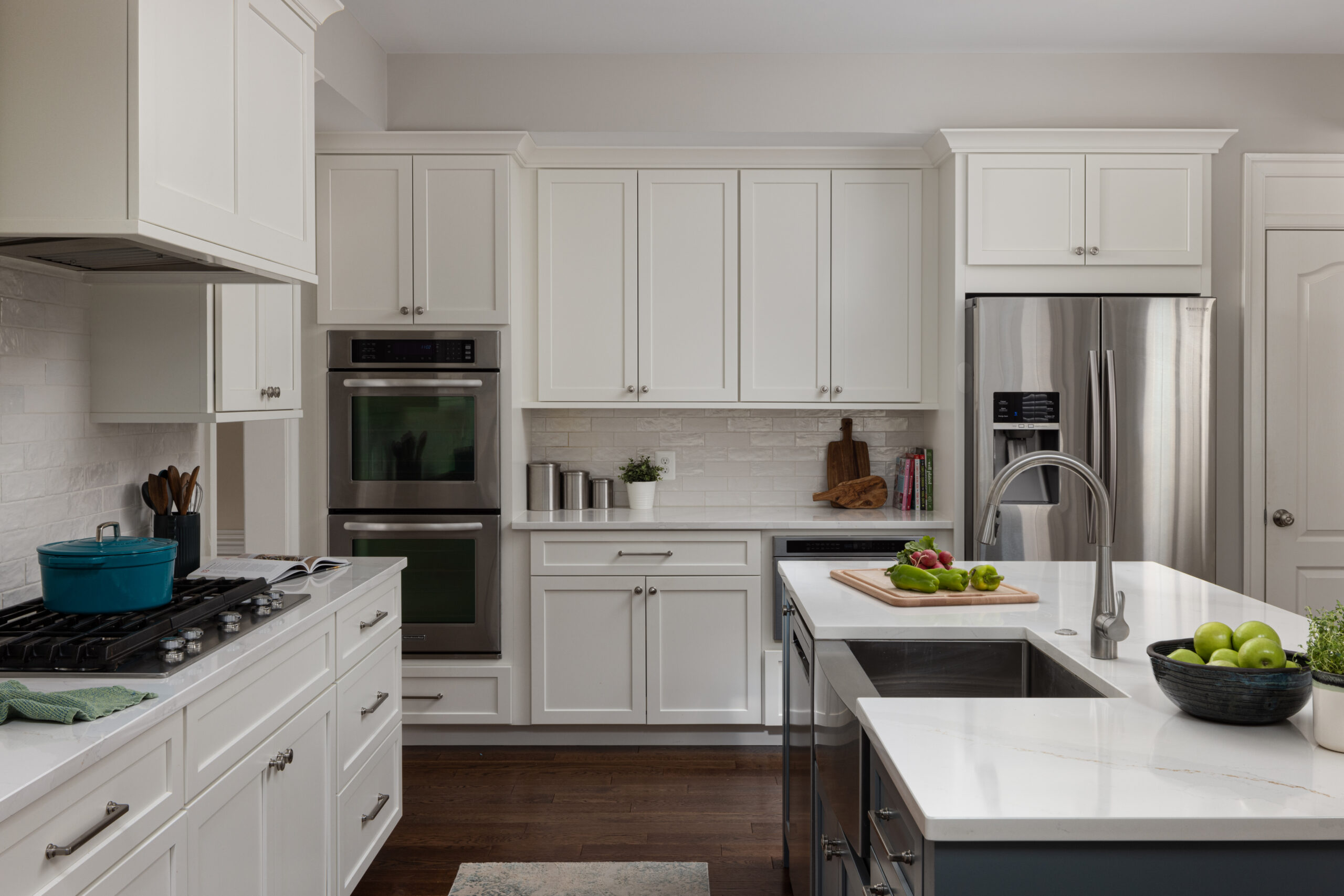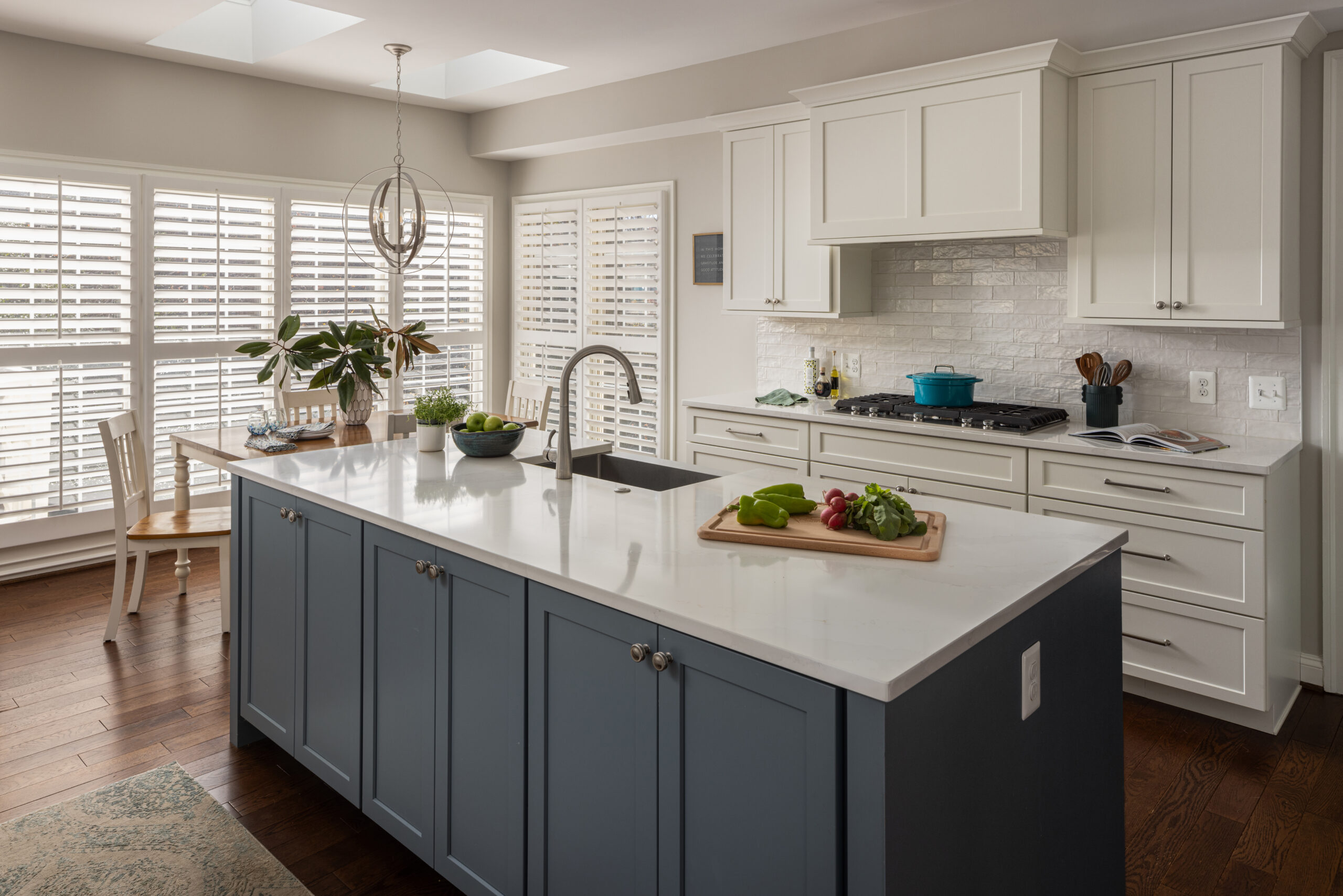The new kitchen design includes double islands which helped improve circulation and provide direct access to the breakfast nook. At the opening, we opted for a two-tiered countertop with bar-height seating ideal for entertaining. The distinct blue-green island offers a pop of color against the backdrop of white counters, cabinets and backsplash. The textured zellige-style subway tile adds visual interest and pairs beautifully with the subtly veined quartz countertops, keeping the space feeling light and bright.