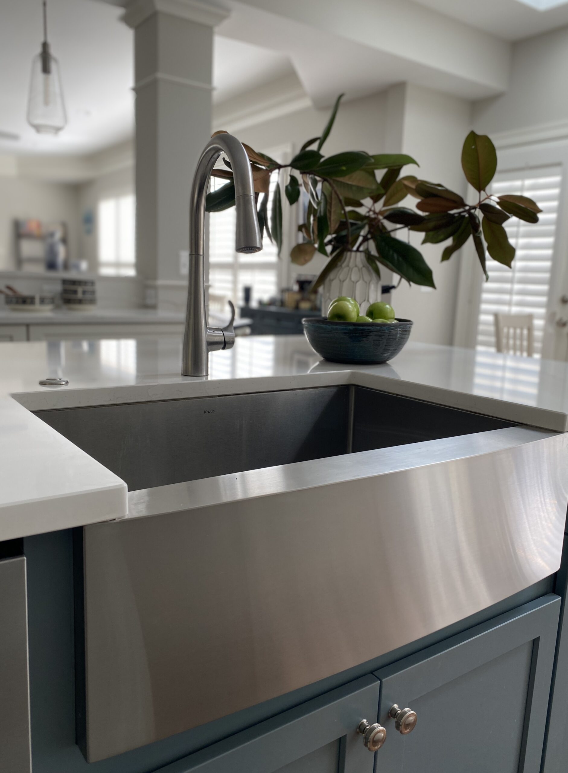 The new layout transforms the kitchen’s flow and the bright and welcoming breakfast nook is no longer cut off by the old peninsula. The center island provides a generous amount of prep space and storage and houses a stainless farmhouse sink, dishwasher, and trash roll-outs on one side with an additional bank of cabinets on the other. A new 6-burner gas cooktop was installed with a custom wood hood above. We incorporated a new microwave drawer and were able to repurpose our client’s existing double wall ovens and refrigerator that were only a few years old.