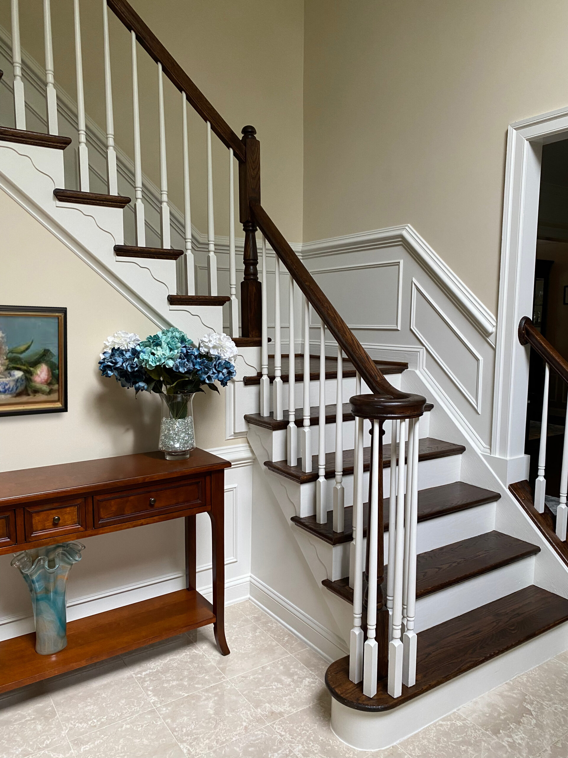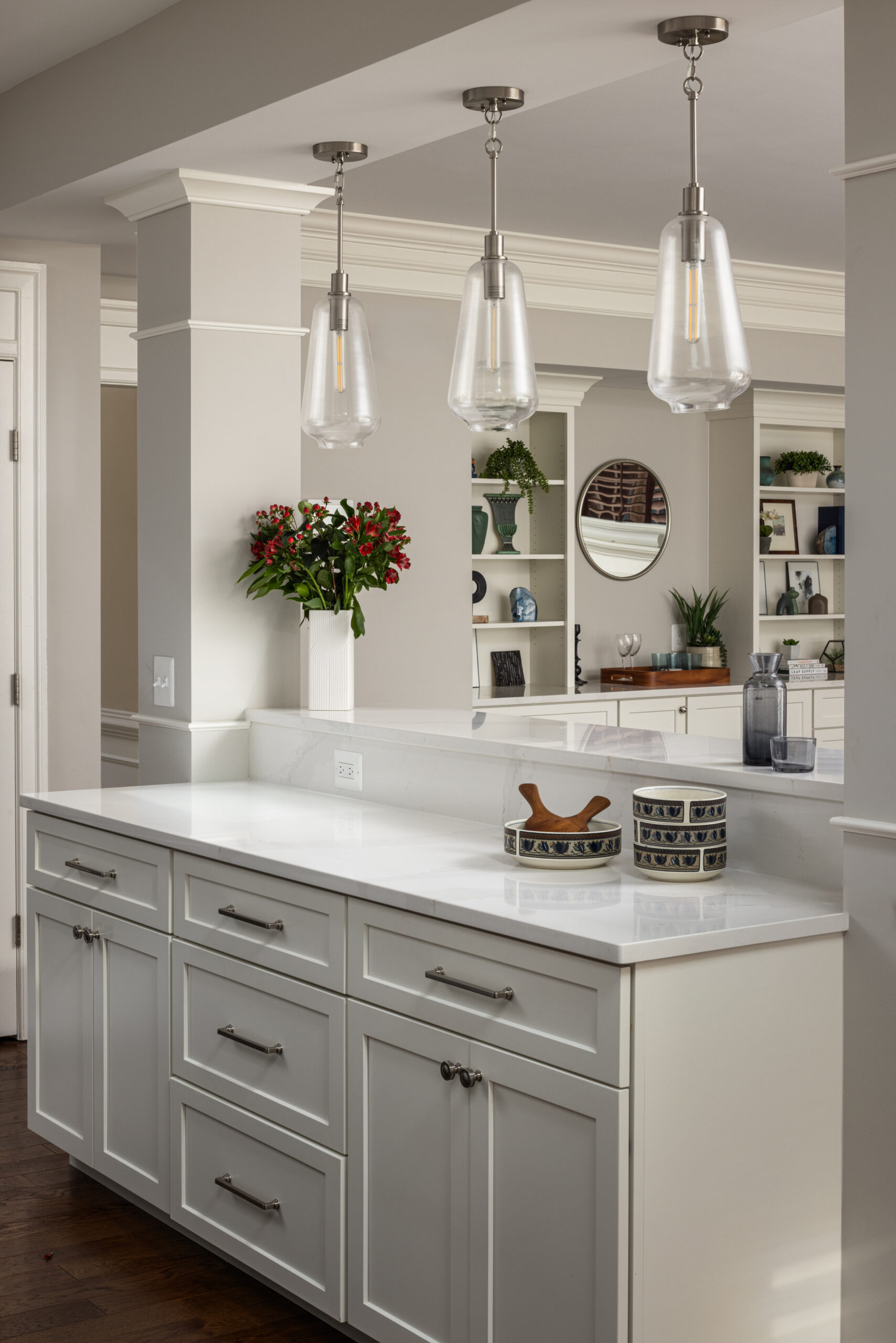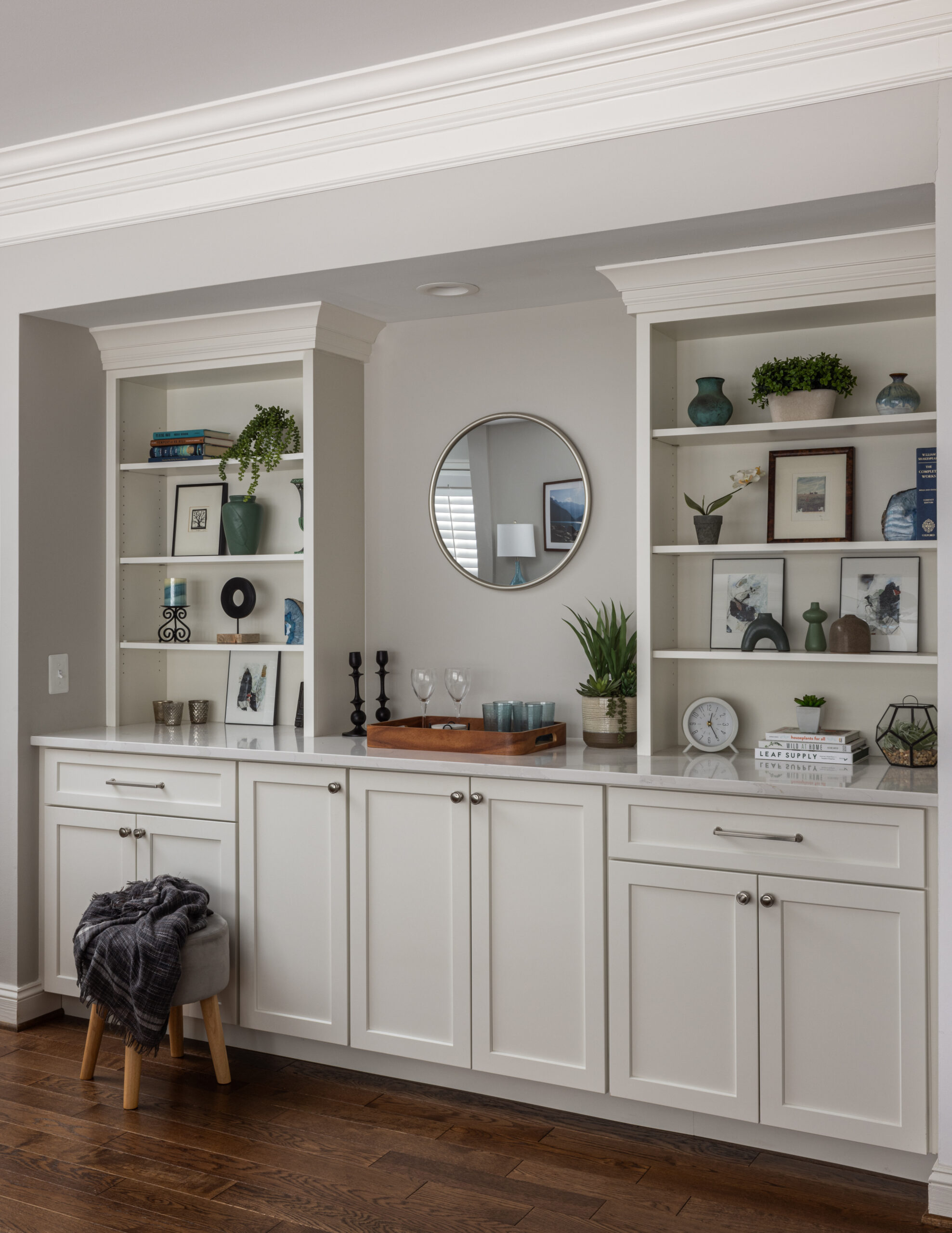 Custom built-ins in the family room were designed to coordinate with the finishes in the adjacent kitchen; they provide both display space and closed storage. To visually connect the spaces, we replaced the dated tile in the kitchen and carpet in the family room with new hardwood flooring that was carried throughout the main level. The front staircase was refinished to match the new darker oak floors