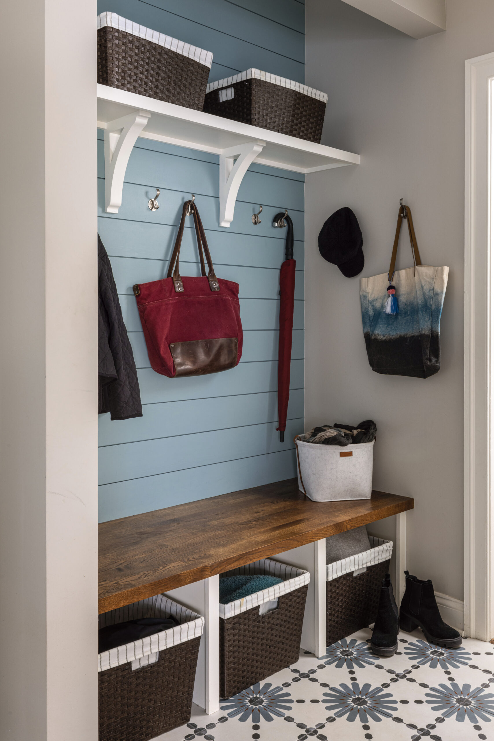 An existing coat closet near the garage entry was converted into an open mudroom/drop zone. Encaustic inspired tiles with a durable matte finish are perfect for this high traffic area and we carried them into the adjacent hallway, powder room and laundry room which was also given a facelift. Open cubbies, baskets and lots of hooks provide ample storage for an active family of four.
