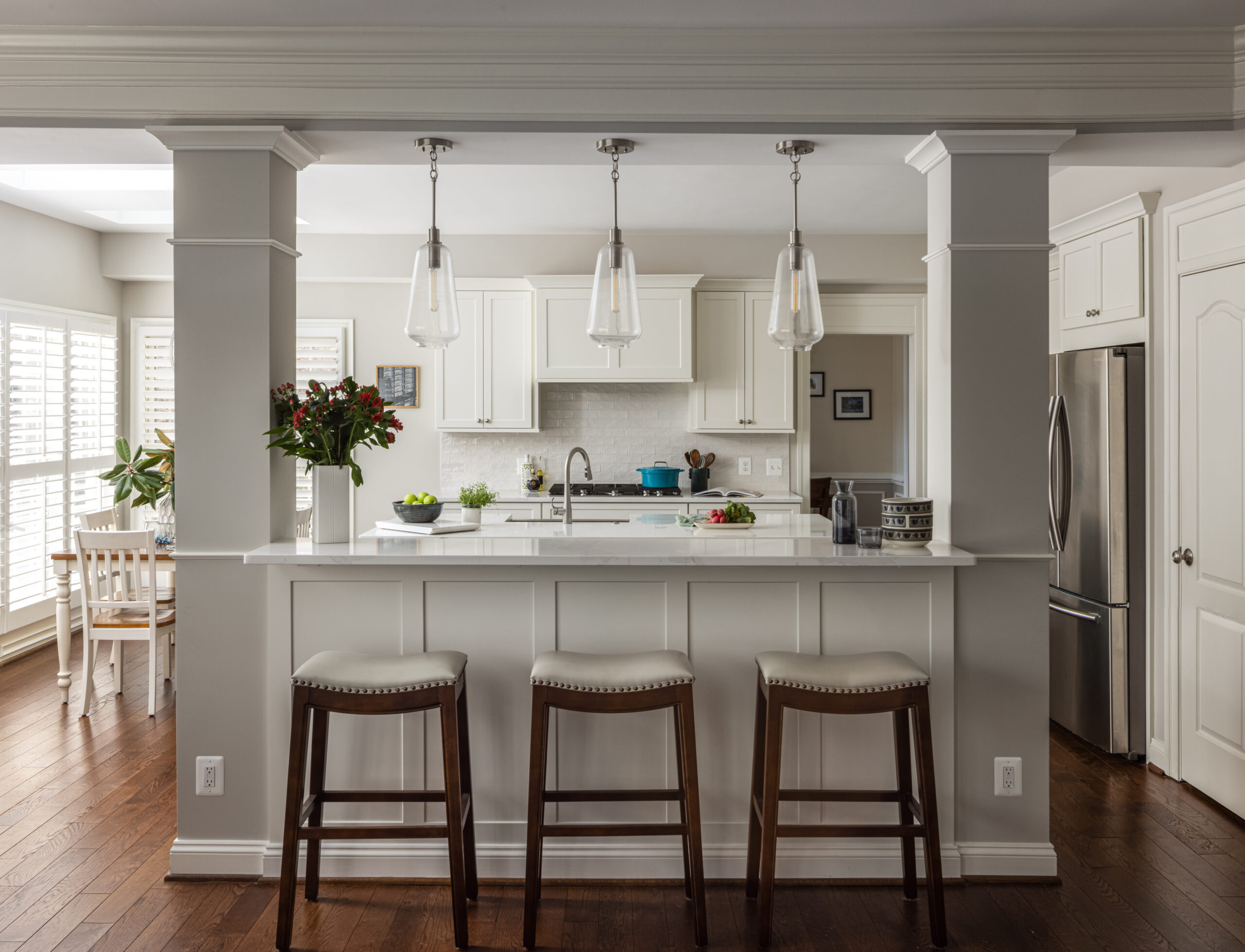 Originally built in 1915, our client’s home in the Del Ray neighborhood of Alexandria had undergone two major additions/renovations over the years, but parts of the home hadn’t been touched in decades and that included a dark and outdated kitchen. Our clients dreamed of a more functional space with improved flow, better connectivity and a more welcoming aesthetic. After exploring several options, we determined that the best way to achieve their goals was to totally reimagine the layout. We gutted the old kitchen, removed walls, closets, and bulky soffits, and flipped the kitchen to the opposite side of the house where an underutilized playroom once stood. The reconfiguration required a new structural beam to maximize openness and it paid off with an expanded kitchen, generous island, and plenty of perimeter storage and prep space. We also built out an efficient and well-organized pantry to keep the kitchen counters clutter-free.